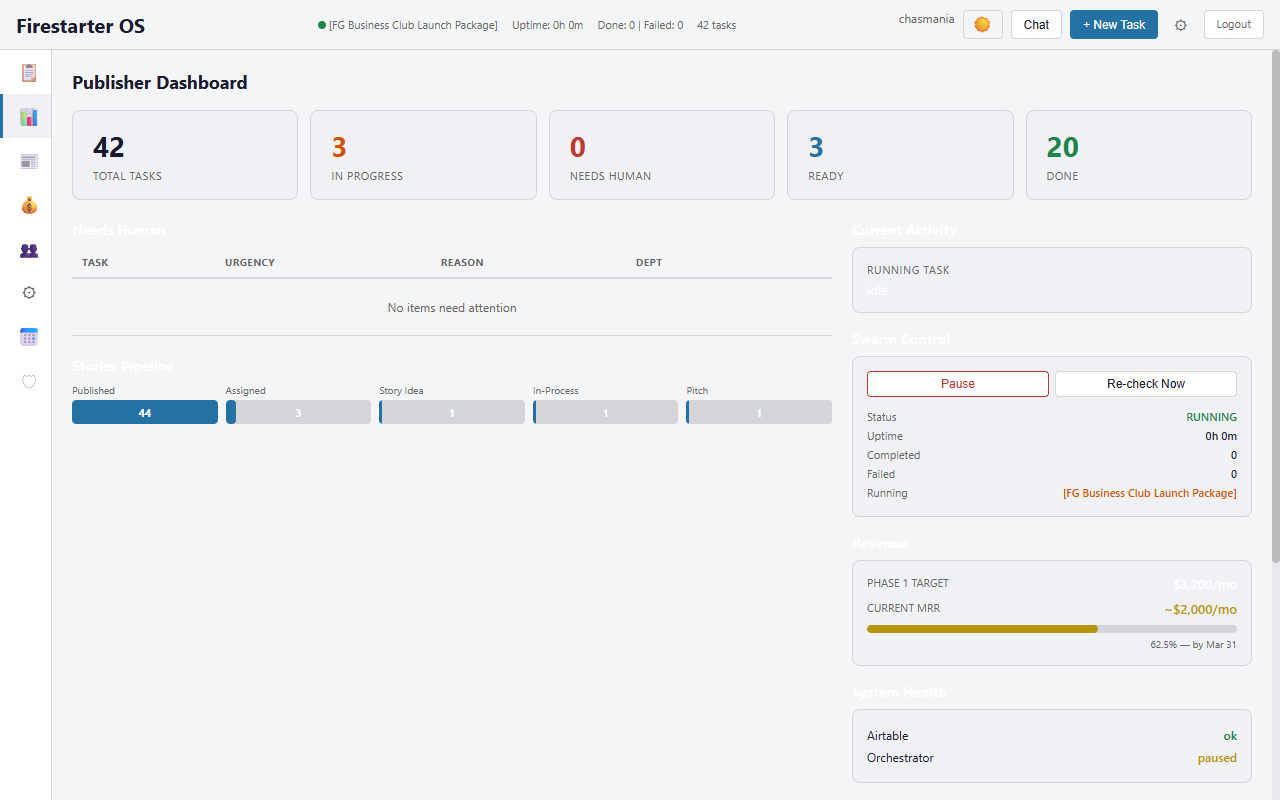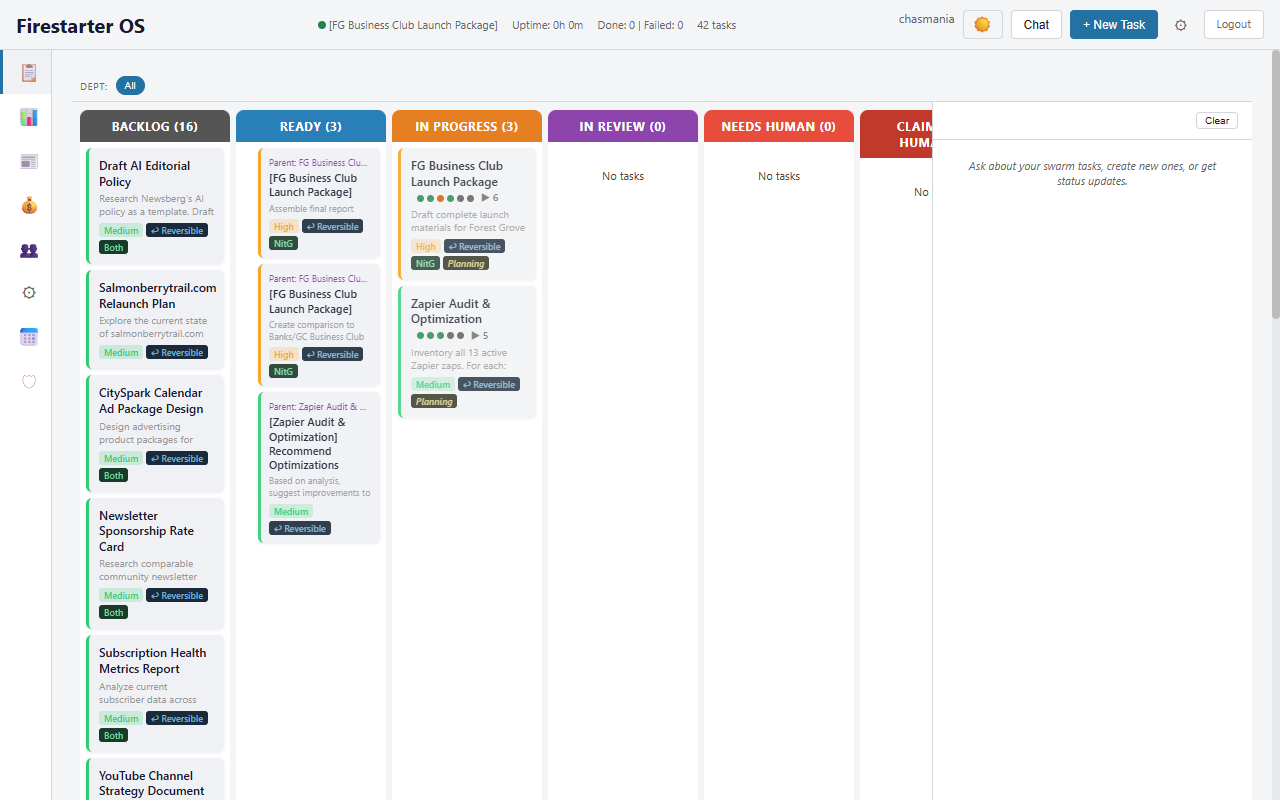 Ghost + Zapier handles publishing and basic automations. Firestarter OS adds an AI agent layer that can actually do work — research, draft summaries, scrape events, manage your task queue, track revenue, and assemble newsletters. It's the difference between connecting tools and having a virtual newsroom assistant.