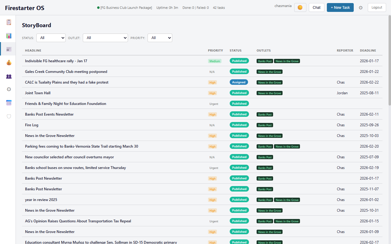 Real screenshots from a live newsroom running on Firestarter OS right now.